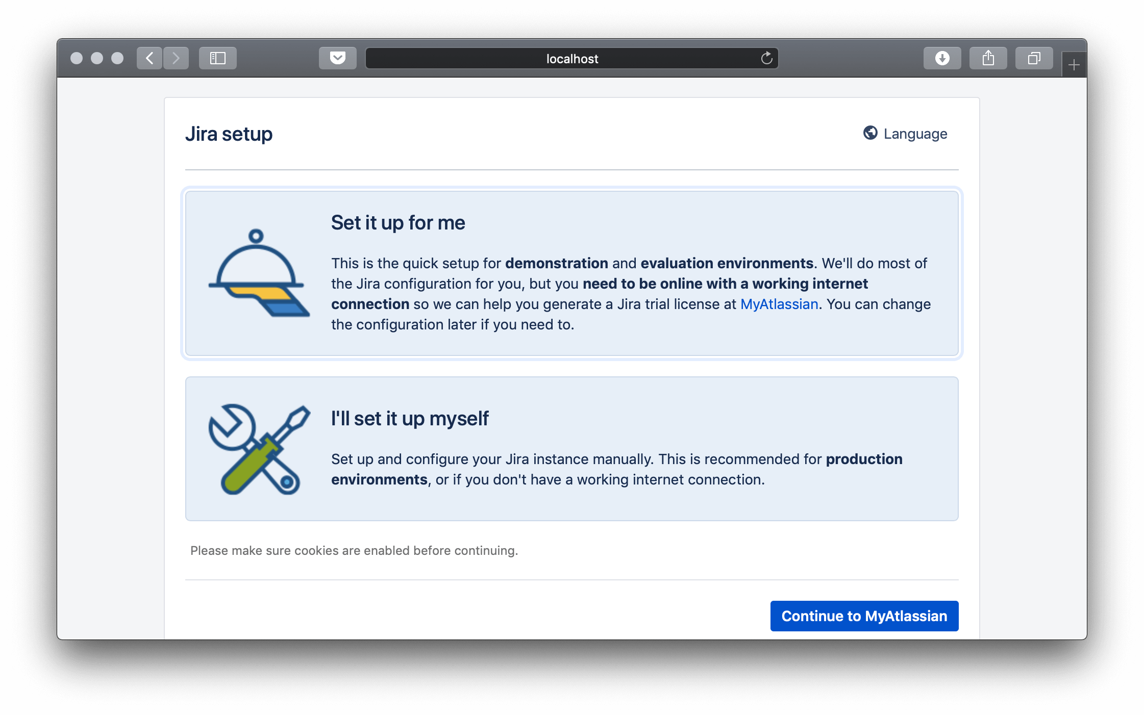 After a successful update, Jira should be available on the listener’s IP address and port. Browse to http://localhost/jira to continue the setup in your browser: