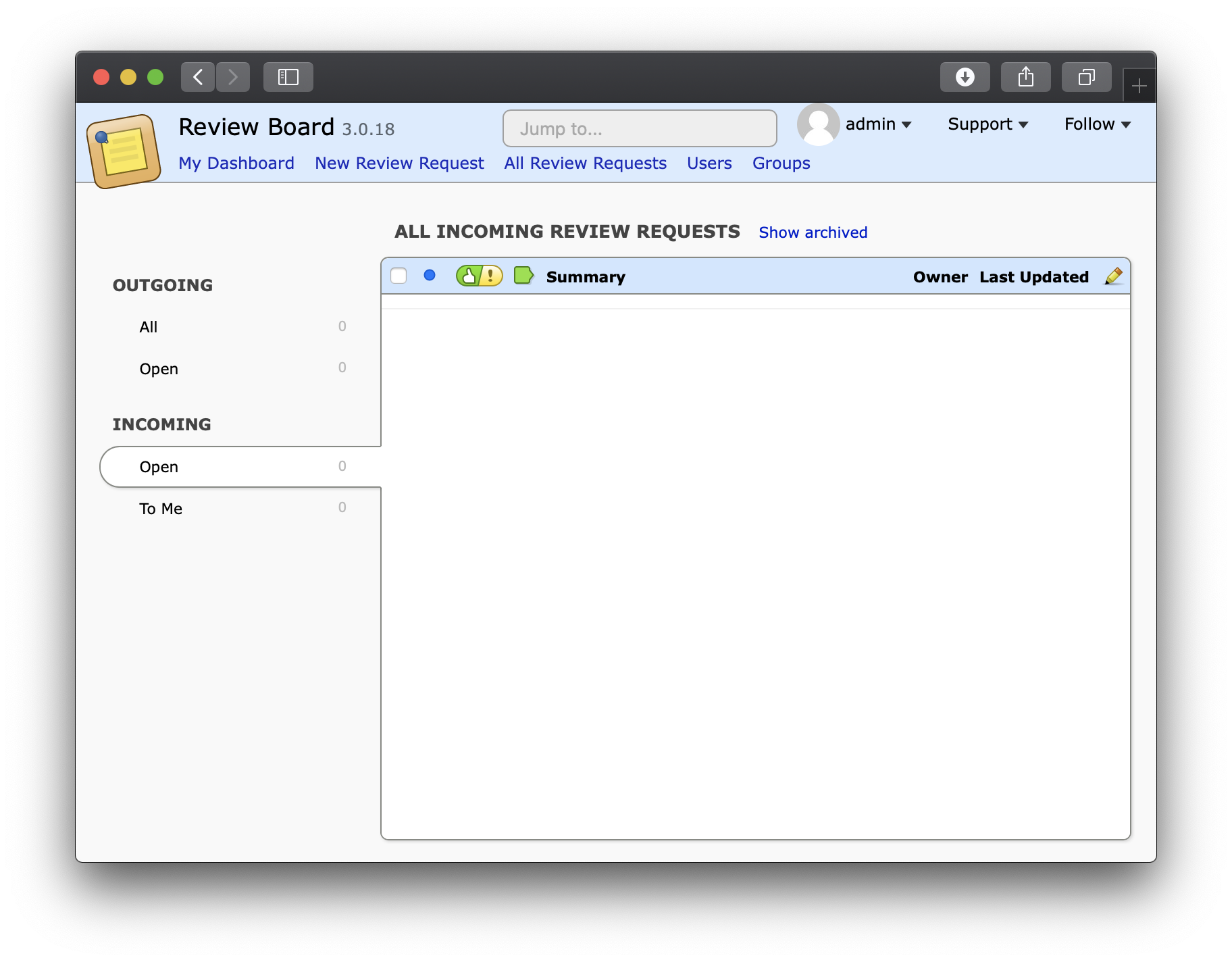 After a successful update, browse to http://localhost and set up your Review Board installation: